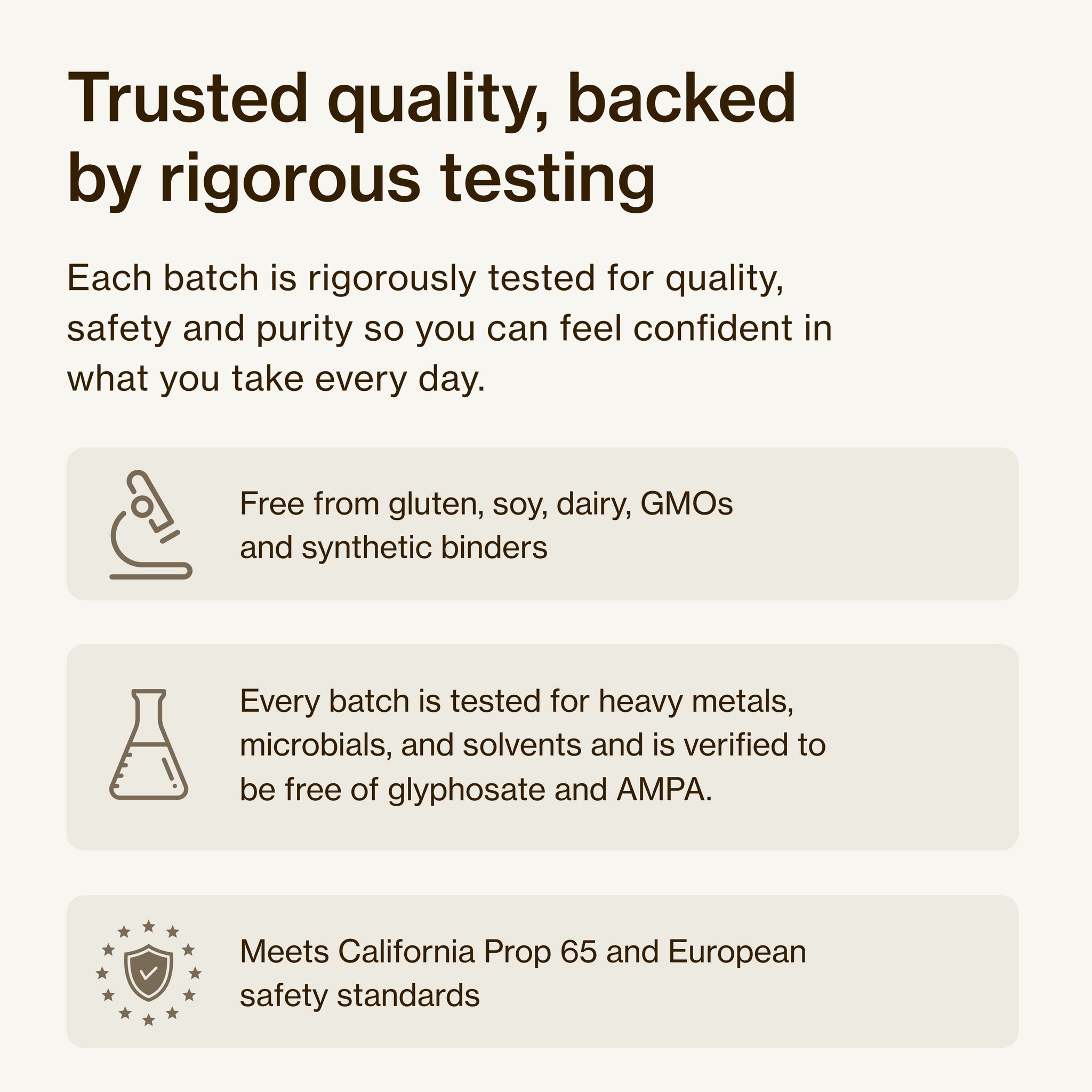 Yes. Every batch is tested for heavy metals, microbials, and solvents. It’s free from gluten, soy, dairy, and corn.